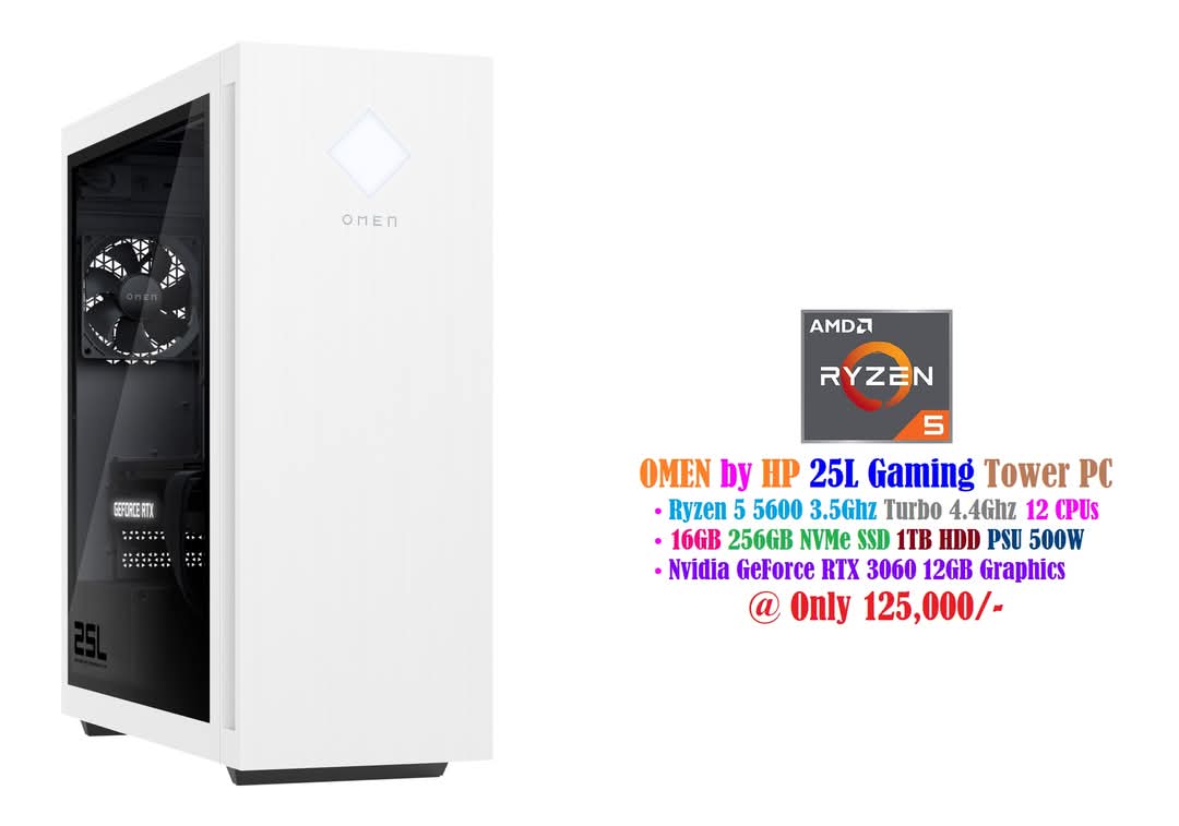 HP OMEN 25L Gaming Tower Ryzen 5 5600 3.5Ghz 16 CPUs 16GB 256GB NVMe SSD 1TB HDD PSU 500W Nvidia GeForce RTX 3060 12GB Graphics